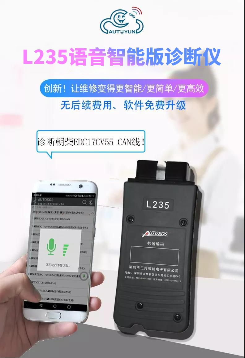 聯(lián)動云L235手機版柴油解碼器是深圳市三羚公司基于手機安卓系統(tǒng)開發(fā)的一款便攜式柴油發(fā)動機故障解碼器,主要適用對象為汽修學徒和運輸公司及車隊司機,聯(lián)動云手機版柴油解碼器可以輕松實現(xiàn)讀取發(fā)動機故障碼,清除發(fā)動機故障碼,讀取發(fā)動機數(shù)據(jù)流,動作測試,元器件測試等諸多實用的功能,是柴油車維修學徒和柴油車駕駛員必不可少的袖珍工具,當你收到聯(lián)動云手機版柴油解碼器可以直接掃碼下載安裝軟件或者撥打客服熱線4009965230。